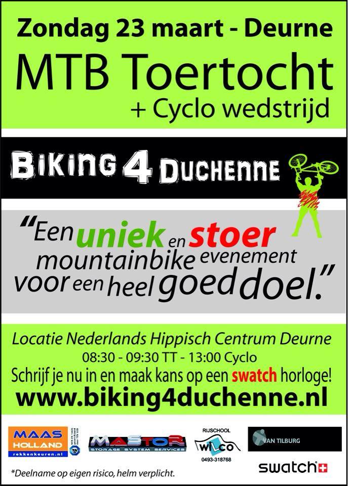 Op zondag 23 maart a.s. wordt in Deurne “Biking 4 Duchenne” georganiseerd. Je kunt dan in en om het Nederlands Hippisch Centrum hier een parcours fietsen dat uitgezet is in samenwerking met veldrijdster Sanne van Paassen. Behalve dat je er een leuke ochtend/dag kunt beleven, is het doel natuurlijk ook om geld in te zamelen voor kinderen met Duchenne spierdystrofie. De organisatoren, Eddy Vocht en Hans van Rijssel vormen samen het […]