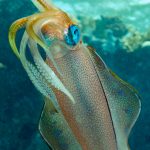Tijdens de tweede duikdag gingen we eerst naar Erg Sabina. Deze duik zal ons in ieder geval bijblijven vanwege de school van zo’n 20 pijlstaartinktvissen die we aan het einde van de duik zagen. En niet als schichtige schimmen die je even zag en die daarna weg waren, maar als een groep die zich rustig liet bekijken en fotograferen. Eentje kwam wel heel uitdagend dichterbij en Niek hing net op het juiste moment onder hem om er een foto van dichtbij van te maken. Door het licht dat er van boven op valt is het een heel mooie foto geworden.