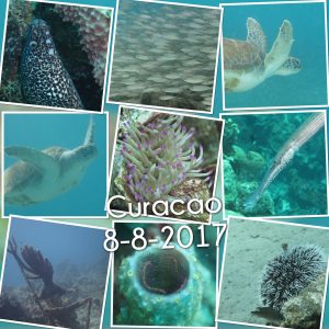 Voor de tweede duik gingen we naar Boca Piscado. Dit is een baai waar veel vissersboten aanleggen. Kleine bootjes met vissers die hun vangst daarna in de baai schoonmaken, verdelen (verkopen). Er zijn een achttal schildpadden die elke dag ook op dat visafval af komen in de baai. Omdat de baai maar een paar meter diep is komen er ook veel snorkelaars op af die graag met de schildpadden op de foto willen. Je snapt het al, het levert een heel dubbel gevoel op. Het rif hier ziet er namelijk een stuk slechter uit dan bij Playa Kalki. Er liggen veel verloren vislijnen, een zielige stapel motorblokken die als “kunstmatig” rif dienst zou moeten doen en een standbeeld ter ere van Neptunus.