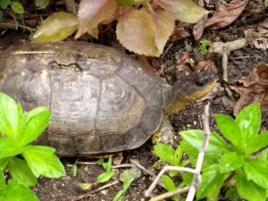 Je hoeft hier niet perse het water in voor schildpadden, soms kom je ze ook langs het pad in de struikjes tegen.