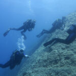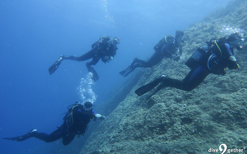 De tweede duik voor het eerst met z’n vijven. Omdat Ardian nog “maar” Open Water duiker is, geldt vanaf dat moment een dieptebeperking van 18 meter. Voor het overige geen verschil omdat ook Ardian goed met zijn lucht omgaat. Deze keer linksom door de baai van Shinaria.
